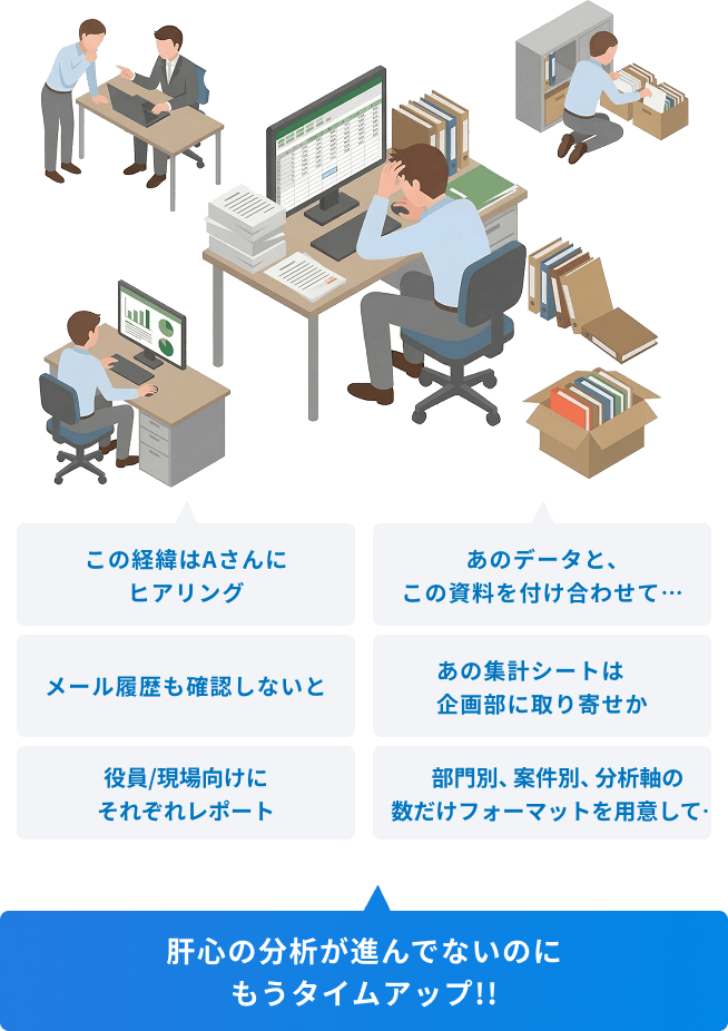 役員向け、現場向けなど複数形式のアウトプットを用意する必要があり、分析の時間が削られる