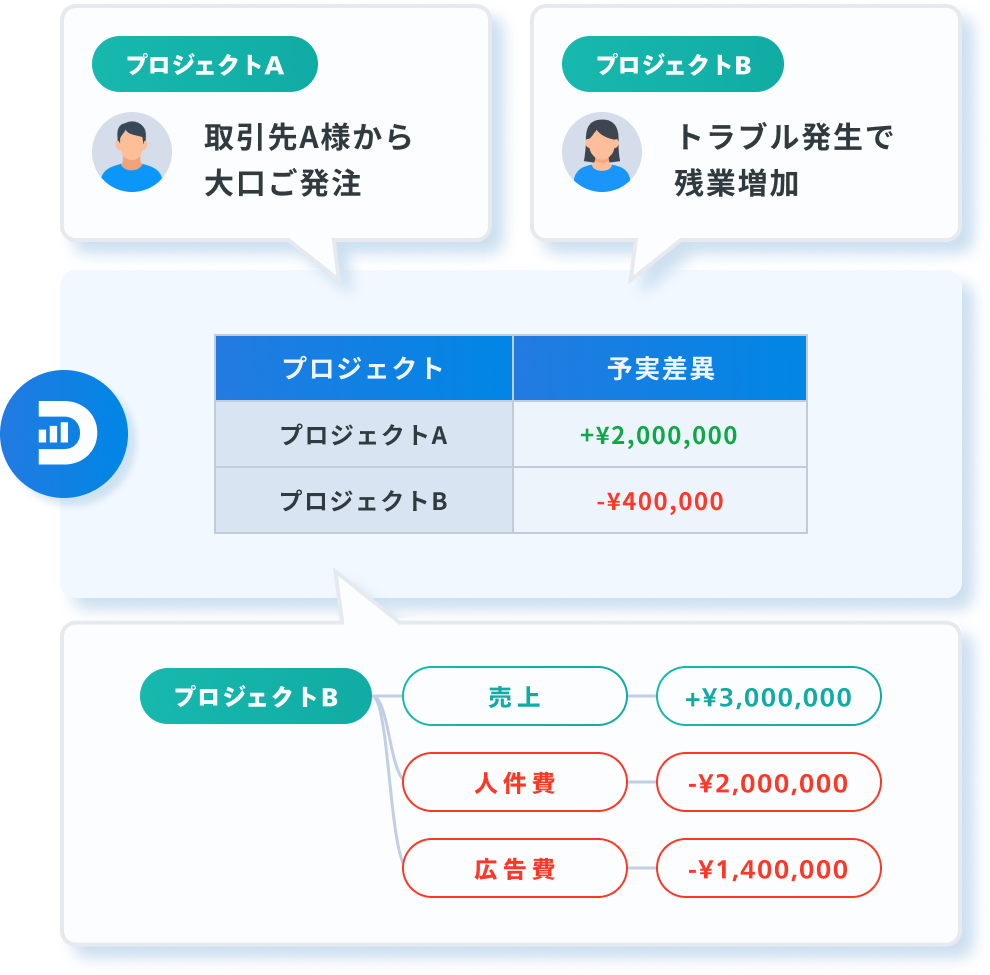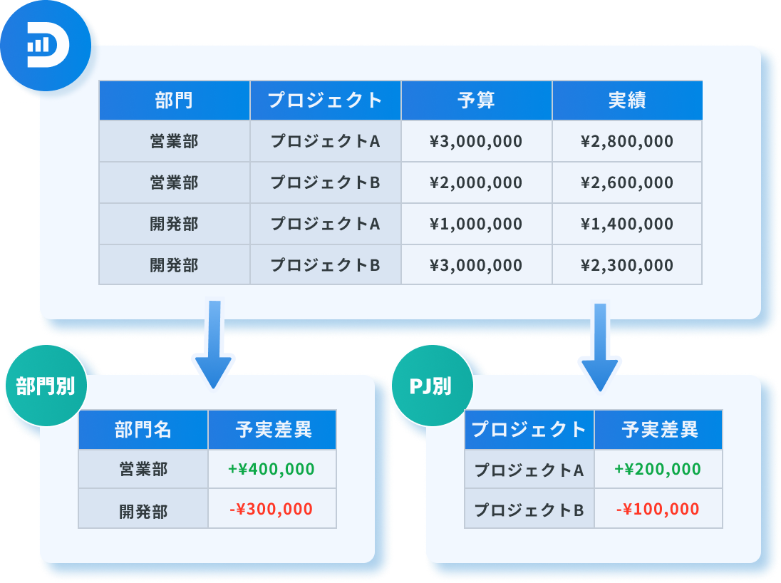 - 部門・プロジェクト・属性などの軸を切り替えるだけで、同じデータから即座に再分析が可能