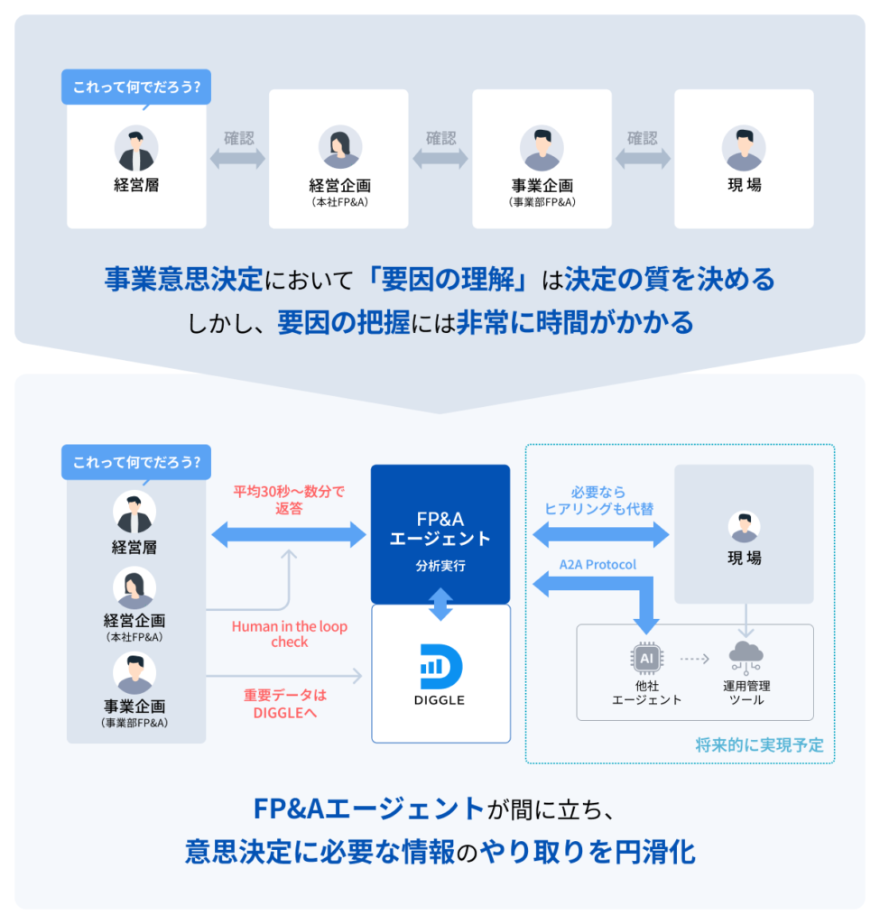 経営資源の戦略的な投資判断を支える経営管理プラットフォーム「DIGGLE」を開発・提供するDIGGLE株式会社(本社 : 東京都港区、代表取締役 : 山本 清貴)は、「DIGGLE予実管理」において、対話型のAIエージェントである「FP&Aエージェント※1」を2025年12月24日より提供開始します。意思決定に必要な社内の経営データの収集や要因分析を「FP&Aエージェント」が代替することで、スピーディな意思決定に貢献します。今後もプロダクトの強化を行なっていくことで、経営企画・FP&Aが経営者や事業部のパートナーとしてより一層貢献できる”AIネイティブな”FP&A業務の実現を目指します。